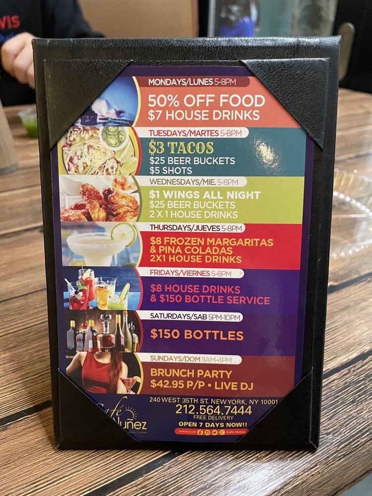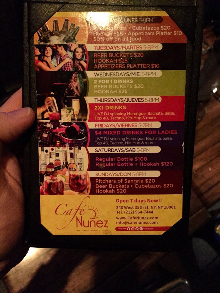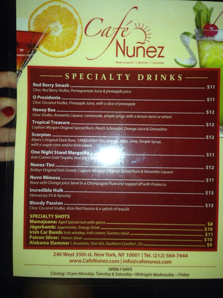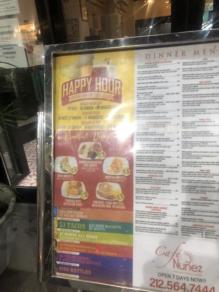 Introducing the menu at Cafe Nunez, a hookah bar offering Latin American and New American cuisine in the heart of New York City. With a wide range of options for vegetarians and various payment options including Android and Apple Pay, Cafe Nunez provides a convenient and inclusive dining experience. The casual atmosphere with outdoor seating, DJ, and happy hour specials make it a perfect spot for gatherings with friends or family. The menu features delicious sandwiches & wraps, fresh bagels, and hearty platters like the Western Omelette and Greek Omelette. The Lox Sandwich and Veggie Cream Cheese bagel stand out as must-try items. With a diverse menu and vibrant ambiance, Cafe Nunez is sure to impress both locals and visitors looking for a unique dining experience.